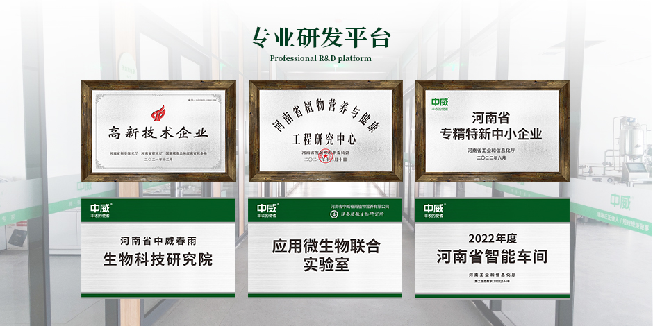 2021,中威春雨獲“高新技術企業”、“河南省中威春雨植物營養與健康工程技術中心”,與陜西省微生物研究所建立微生物聯合實驗室,微生物系列產品研發上市。